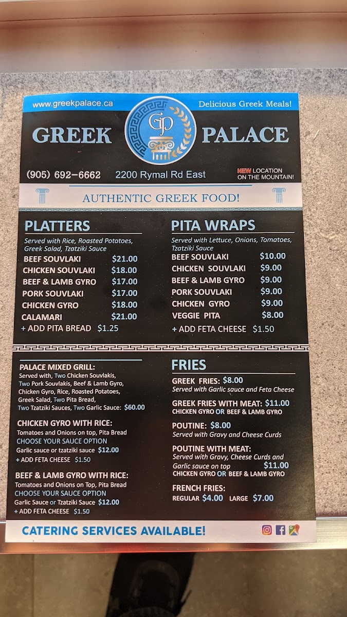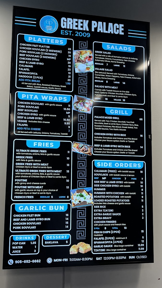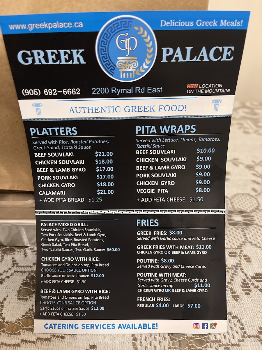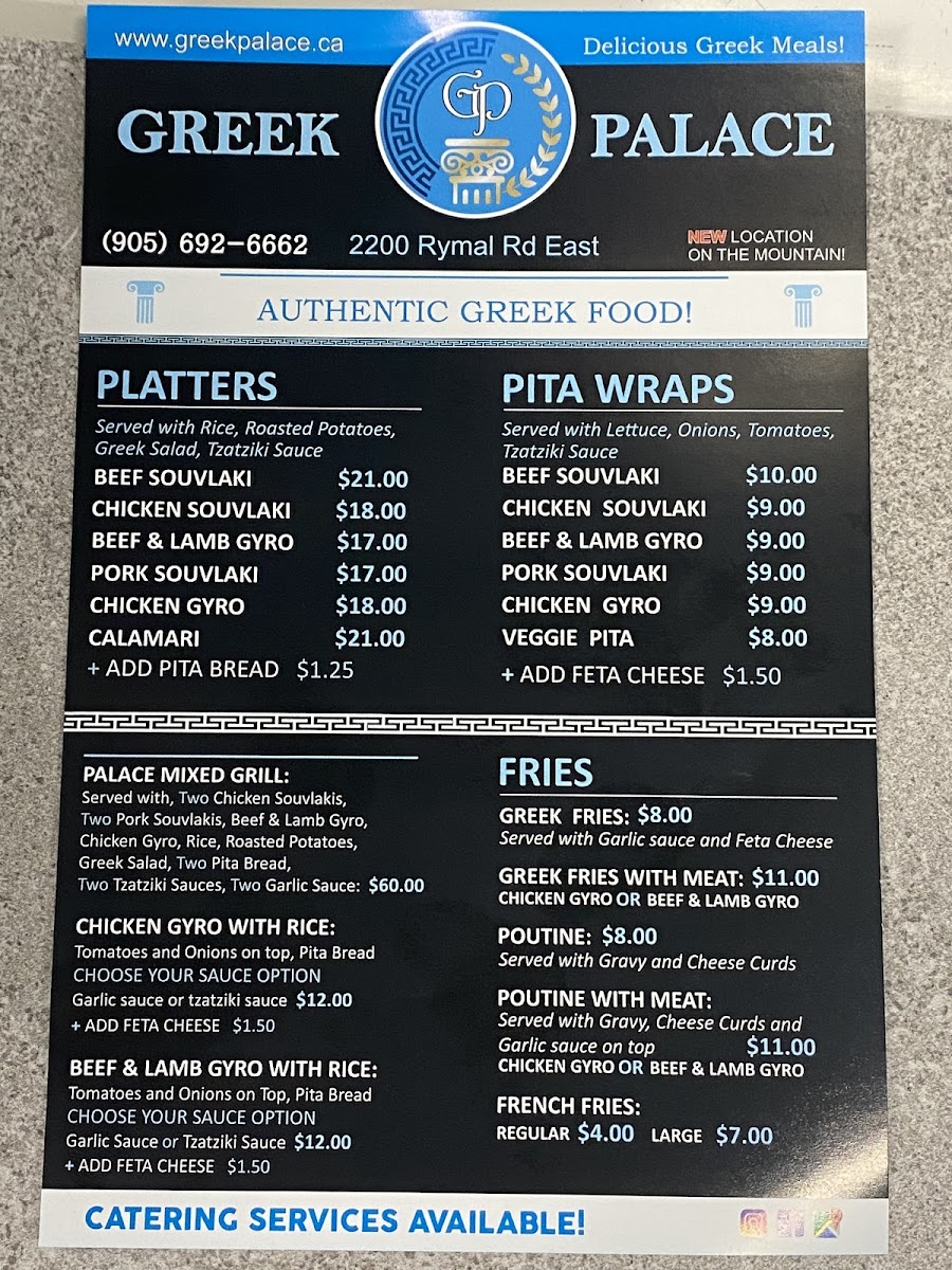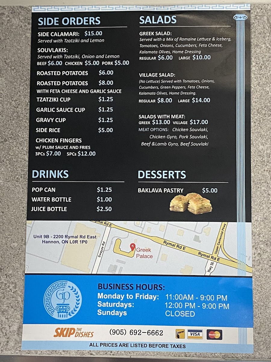 Welcome to Greek Palace - Hannon, a culinary gem nestled in Hannon, Ontario, where tradition meets flavor. The menu is a vibrant showcase of classic Greek dishes that promise to tantalize your taste buds. From the Beef and Lamb Gyro Platter to the succulent Chicken Souvlaki Platter, each dish is generously served with fragrant rice, crispy roasted potatoes, refreshing Greek salad, and rich tzatziki sauce for only CA$22.00 to CA$26.00.